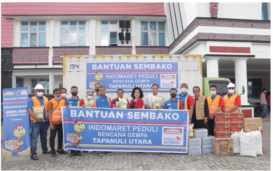 Kabupaten Tapanuli Utara, Sumatera Utara diguncang gempa berkekuatan magnitudo 6,0 pada Sabtu (1/10/2022), dini hari. Membantu upaya pemerintah daerah dalam penanganan gempa, Indomaret memberikan bantuan berupa sembako dan masker medis untuk para korban. Bantuan diserahkan Deputy Branch Manager (DBM) Administrasi Indomaret Medan, FX Novendra kepada Ketua TP PKK Tapanuli Utara Satika Simamora (Istri Bupati Tapanuli Utara) didampingi DBM Operasional Indomaret Medan, Ferry Suharyanto di Kantor Bupati, Minggu (2/10/2022). Diharapkan bantuan tersebut dapat meringankan beban warga Tapanuli Utara yang terdampak gempa bumi.