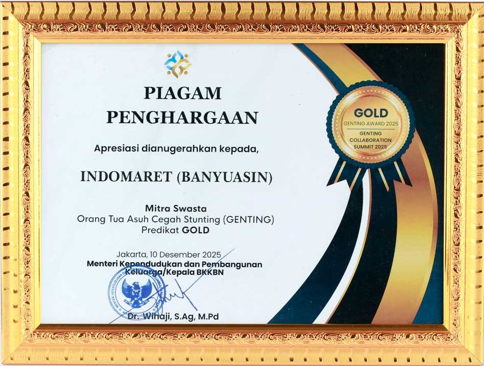 Indomaret kembali menambah daftar prestasinya pada tahun 2025. Melalui perwakilan cabang Banyuasin, Indomaret berhasil meraih Predikat GOLD kategori Mitra Swasta dalam ajang Genting Collaboration Summit 2025 yang mengusung tema “Sinergi untuk Negeri, Wujudkan Indonesia Bebas Stunting,” yang dihelat di JS Luwansa Hotel, Kuningan, Jakarta Selatan, Rabu (10/12/2025). Acara tersebut dihadiri oleh Menteri Kependudukan dan Pembangunan Keluarga/Kepala Badan Kependudukan dan Keluarga Berencana Nasional (BKKBN), Dr. Wihaji, S.Ag, M.Pd., serta lebih dari 300 nominator penerima penghargaan dari unsur pemerintah, BUMN/D, swasta, hingga perorangan dari seluruh Indonesia.