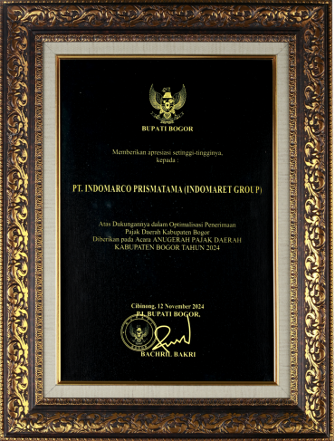 Indomaret menerima penghargaan Anugerah Pajak Daerah tahun 2024  dari Pj. Bupati Bogor, Bachril Bakri, atas perannya dalam mendukung layanan pembayaran Pajak Bumi dan Bangunan (PBB) di Kabupaten Bogor sejak bulan Juli 2019. Penghargaan ini diterima oleh Business Development Manager PT Indomarco Prismatama (Indomaret), Arbet Nofem Cornelis di Harris Hotel & Convention Cibinong City Mall, Selasa (12/11/2024). Hal ini sebagai bentuk apresiasi atas kontribusi Indomaret dalam mempermudah masyarakat melaksanakan kewajiban pajak melalui jaringan gerai yang tersebar luas.